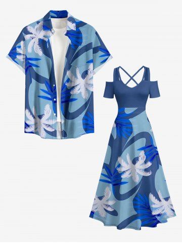 Plus Size Coconut Tree Tropical Leaf Print Hawaii Cold Shoulder Crisscross A Line Maxi Dress - Blue - Xxs