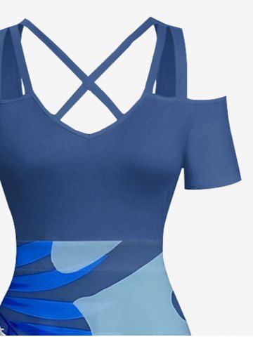 Plus Size Coconut Tree Tropical Leaf Print Hawaii Cold Shoulder Crisscross A Line Maxi Dress - Blue - Xs