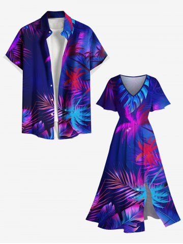 Plus Size Coconut Tree Tropical Leaf Print Split Hawaii Midi Dress - Purple - 5x