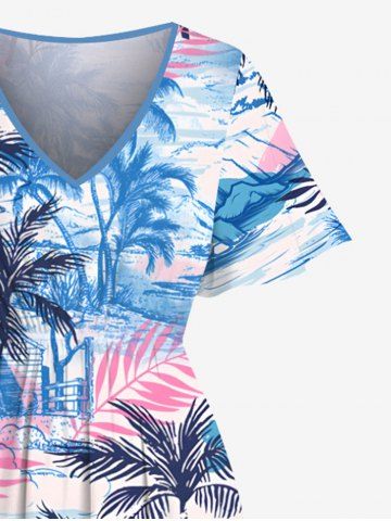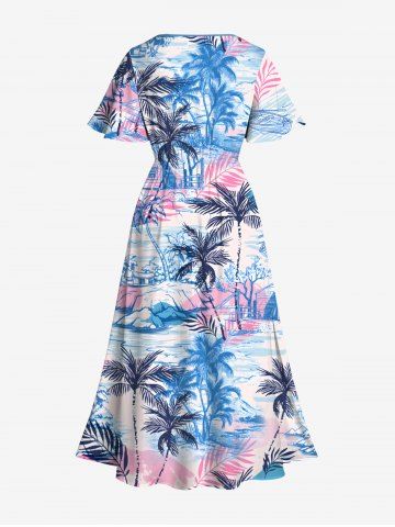 Plus Size Coconut Tree Tropical Leaf Print Split Hawaii Midi Dress - Sky Blue - 3x
