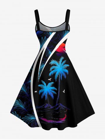 Plus Size Coconut Tree Tropical Leaf Sun Sea Waves Print Hawaii Tank Dress - Black - 4x