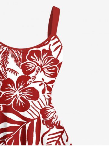 Plus Size Coconut Tree Tropical Leaf Hibiscus Flower Print Hawaii A Line Tank Dress - Red - M