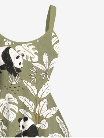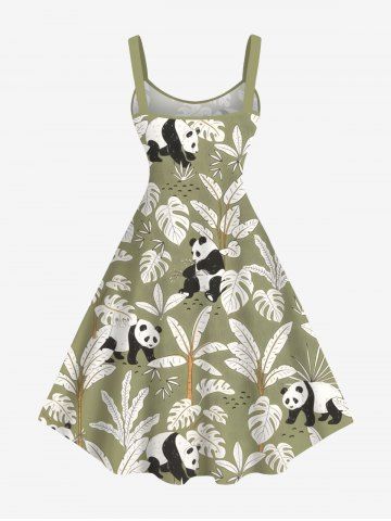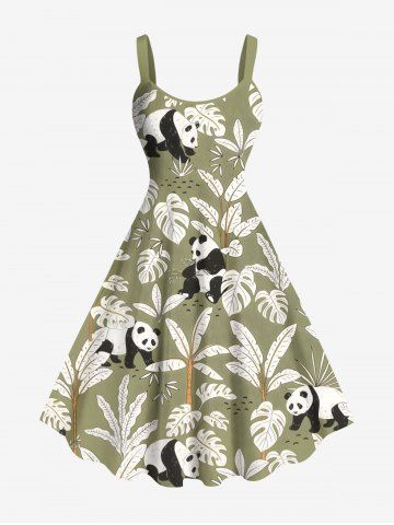 Plus Size Coconut Tree Tropical Leaves Panda Print Hawaii A Line Tank Dress - Light Green - 3x