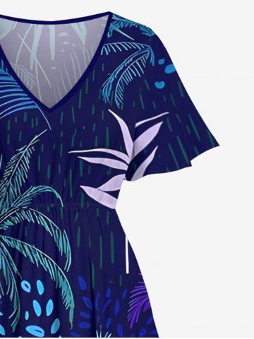 Plus Size Coconut Tree Tropical Leaves Print Hawaii Ombre Split Pocket A Line Midi Dress - Blue - 5x