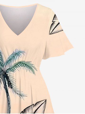 Plus Size Coconut Tree Tropical Leaves Print Hawaii Split Pocket A Line Midi Dress - Champagne - 1x