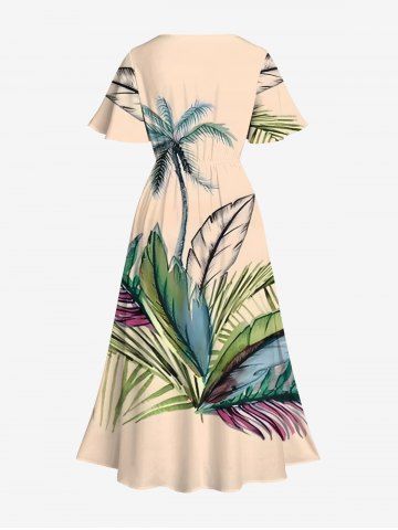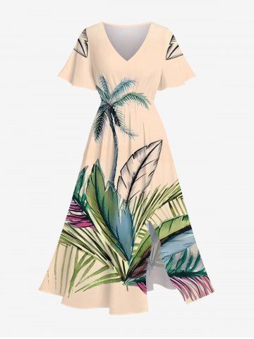 Plus Size Coconut Tree Tropical Leaves Print Hawaii Split Pocket A Line Midi Dress - Champagne - 6x