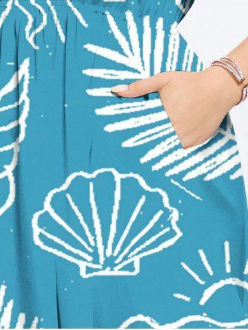 Plus Size Coconut Tree Tropical Leaf Sun Shell Print Hawaii Split Pocket A Line Midi Dress - Blue - 4x