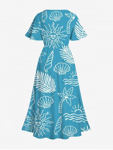 Plus Size Coconut Tree Tropical Leaf Sun Shell Print Hawaii Split Pocket A Line Midi Dress - Blue - 5x
