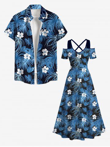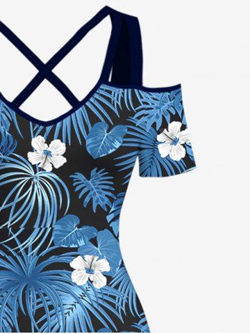 Plus Size Cold Shoulder Coconut Leaf Flower Print Hawaii Crisscross A Line Dress - Blue - 3x