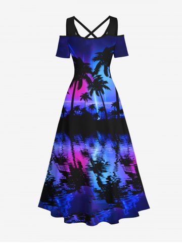 Plus Size Cold Shoulder Coconut Tree Ombre Aurora Sea Print Hawaii Crisscross A Line Dress - Multi-a - L