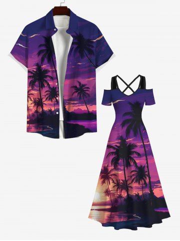 Graphic Dresses > Plus Size Cold Shoulder Coconut Tree Ombre Sky Dusk Print Hawaii Crisscross A Line Maxi Dress