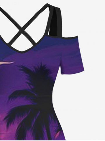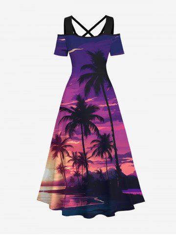 Plus Size Cold Shoulder Coconut Tree Ombre Sky Dusk Print Hawaii Crisscross A Line Maxi Dress - Multi-a - 1x