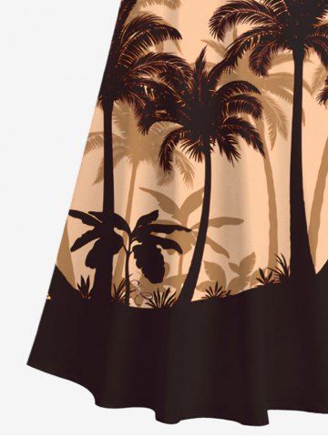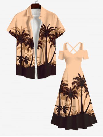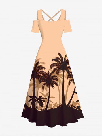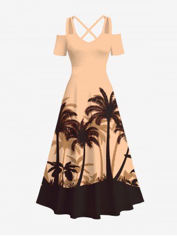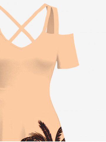 Plus Size Cold Shoulder Coconut Tree Print Hawaii Crisscross A Line Maxi Dress - Light Orange - M