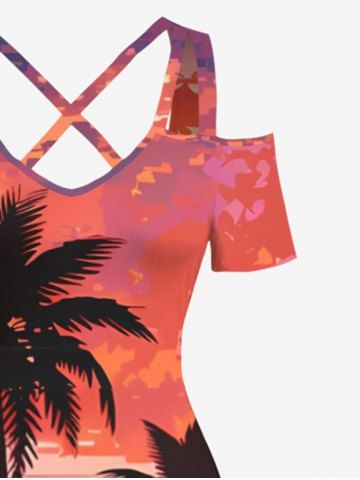 Plus Size Cold Shoulder Coconut Tree Sea Beach Dusk Print Hawaii Crisscross A Line Dress - Red - 3x