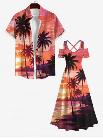 Graphic Dresses > Plus Size Cold Shoulder Coconut Tree Sea Beach Dusk Print Hawaii Crisscross A Line Dress