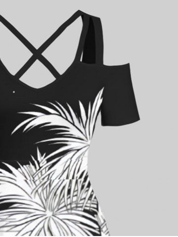 Plus Size Cold Shoulder Coconut Tree Sea Print Hawaii Crisscross A Line Maxi Dress - Black - 6x