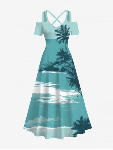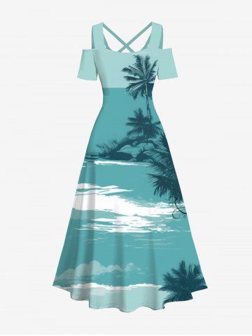 Graphic Dresses > Plus Size Cold Shoulder Coconut Tree Sea Print Hawaii Crisscross A Line Maxi Dress