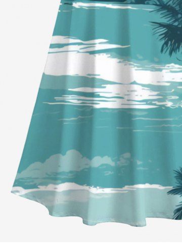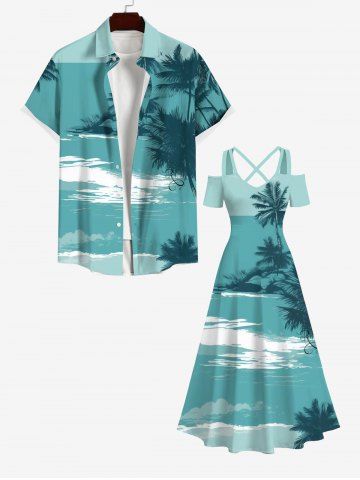 Plus Size Cold Shoulder Coconut Tree Sea Print Hawaii Crisscross A Line Maxi Dress - Green - L