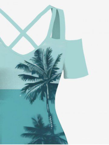 Plus Size Cold Shoulder Coconut Tree Sea Print Hawaii Crisscross A Line Maxi Dress - Green - 6x