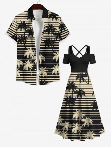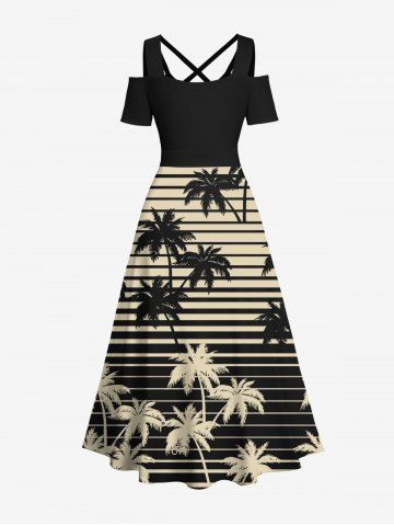 Graphic Dresses > Plus Size Cold Shoulder Coconut Tree Striped Two Tone Print Hawaii Crisscross A Line Maxi Dress