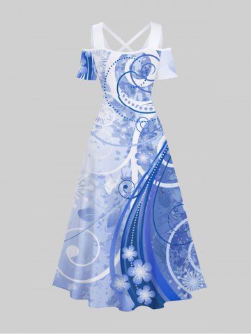 Plus Size Cold Shoulder Curved Line Floral Ombre Plum Bossom Print Hawaii Crisscross A Line Maxi Dress - Multi-a - 4x