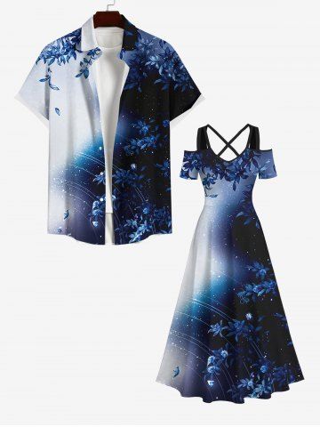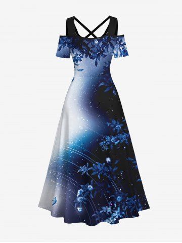 Plus Size Cold Shoulder Floral Leaves Ombre Galaxy Print Hawaii Crisscross A Line Maxi Dress - Blue - S