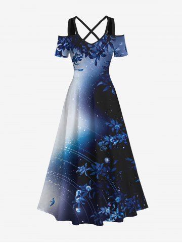 Plus Size Cold Shoulder Floral Leaves Ombre Galaxy Print Hawaii Crisscross A Line Maxi Dress - Blue - 4x