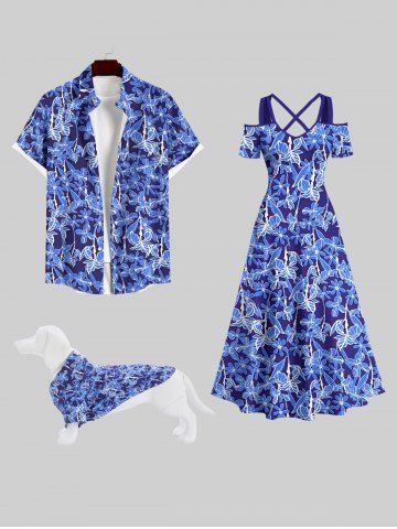 Plus Size Cold Shoulder Flower Leaf Print Hawaii Crisscross A Line Dress - Blue - 6x
