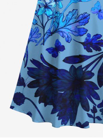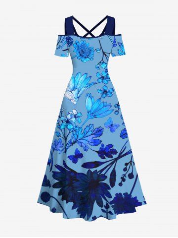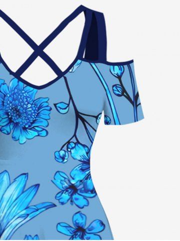 Plus Size Cold Shoulder Flower Leaf Print Hawaii Crisscross Ombre A Line Dress - Blue - 1x