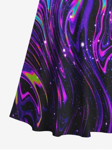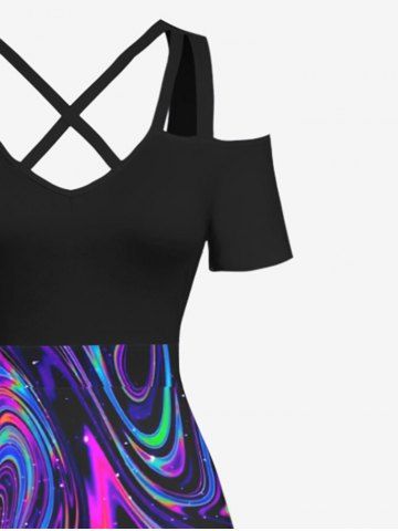 Plus Size Cold Shoulder Glitter Colorful Fluid Galaxy Psychedelic Waves Printed Hawaii Crisscross A Line Maxi Dress - Black - 6x