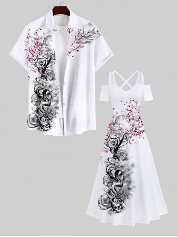 Plus Size Cold Shoulder Ink Painting Rose Flower Tree Branch Print Crisscross A Line Maxi Dress - White - M