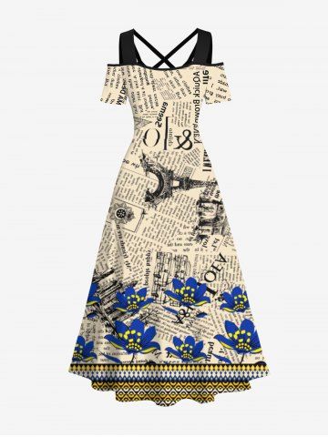 Graphic Dresses > Plus Size Cold Shoulder Newspaper Floral Striped Eiffel Tower Print Crisscross A Line Maxi Dress