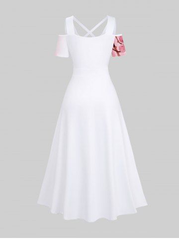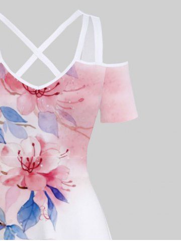 Plus Size Cold Shoulder Ombre Floral Leaves Print Hawaii Crisscross A Line Maxi Dress - White - 4x