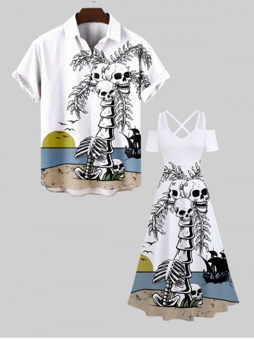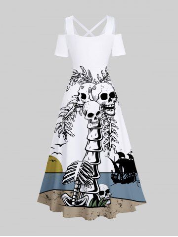 Plus Size Cold Shoulder Skulls Coconut Tree Fish Skeleton Sea Sun Print Hawaii Crisscross A Line Maxi Dress - White - 5x