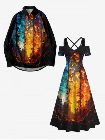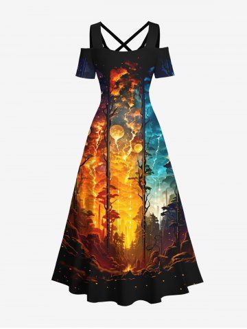 Graphic Dresses > Plus Size Cold Shoulder Sunset Clouds Lightning Forest Print Crisscross A Line Maxi Dress