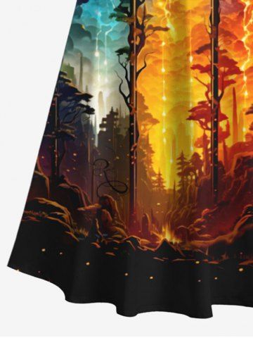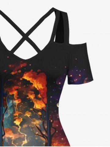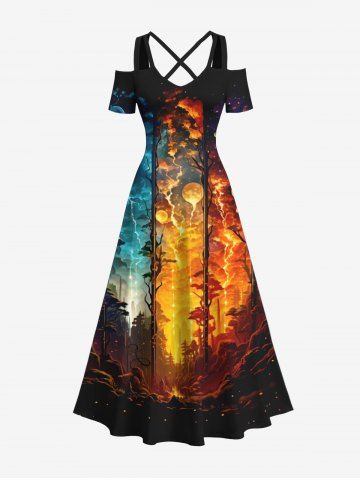 Plus Size Cold Shoulder Sunset Clouds Lightning Forest Print Crisscross A Line Maxi Dress - Black - 6x