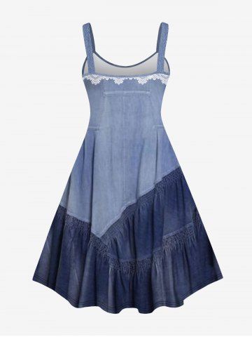 Plus Size Colorblock Appliques Dnim Patchwork 3D Print Tank Dress - Blue Gray - S