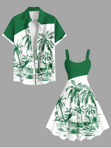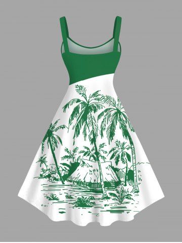 Plus Size Colorblock Coconut Tree Seascape Print Hawaii Tank Dress - Green - 5x