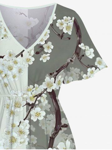 Plus Size Colorblock Peach Blossom Flower Branch Print Split Hawaii Midi Dress - Multi-a - M
