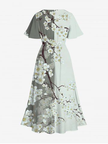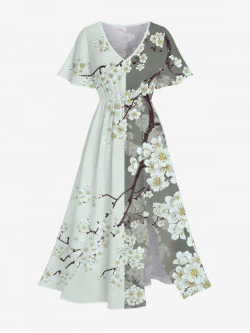 Graphic Dresses > Plus Size Colorblock Peach Blossom Flower Branch Print Split Hawaii Midi Dress