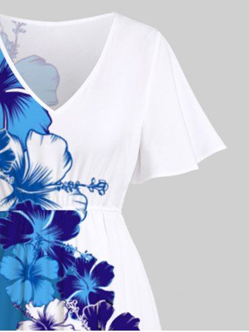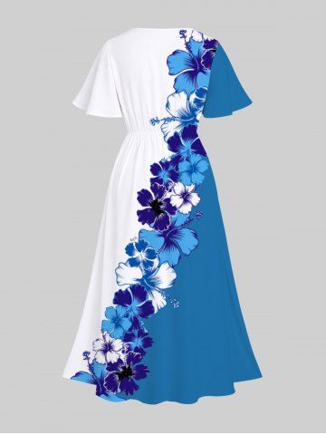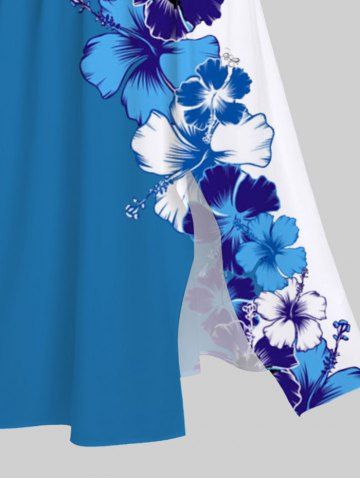 Plus Size Colorblock Tripical Hibiscus Flower Print Split Hawaii Midi Dress - Multi-a - 1x