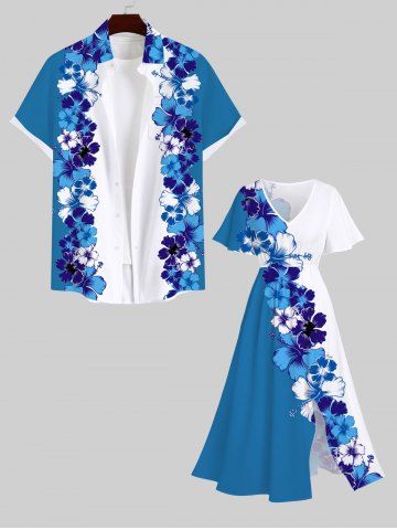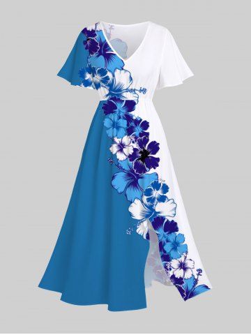 Graphic Dresses > Plus Size Colorblock Tripical Hibiscus Flower Print Split Hawaii Midi Dress
