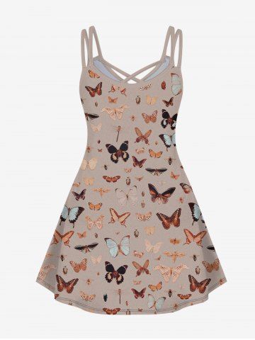 Plus Size Colorful Butterfly Print Crisscross A Line Cami Dress - Coffee - 1x
