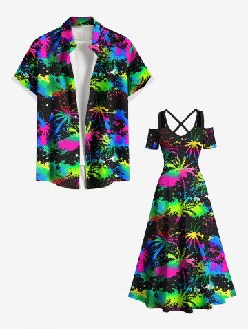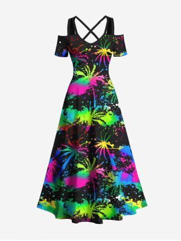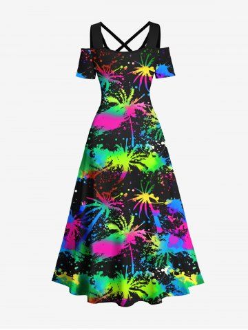 Plus Size Colorful Coconut Tree Paint Splatter Print Cold Shoulder Crisscross Hawaii Maxi Dress - Black - L
