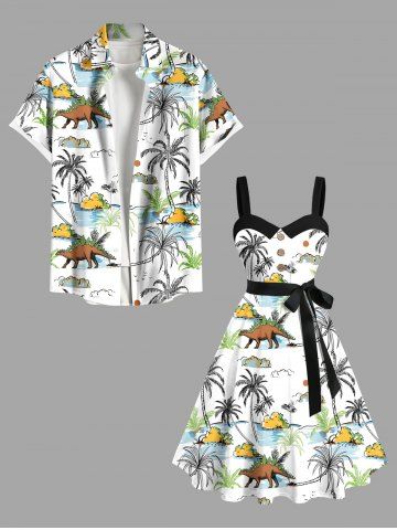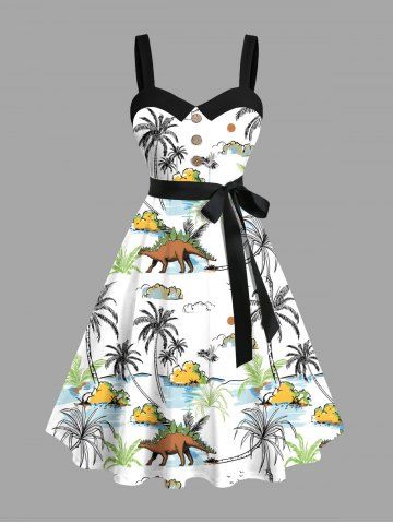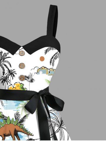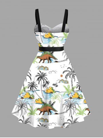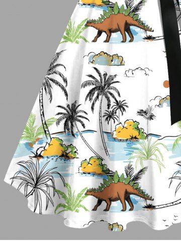 Plus Size Colorful Coconut Tree Sea Cloud Dinosaur Print Hawaii A Line Tank Dress with Removable Belt - White - L