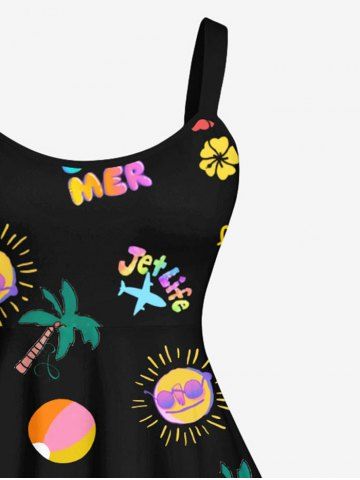 Plus Size Colorful Coconut Tree Sun Letters Floral Print Hawaii Backless A Line Tank Dress - Black - 2x