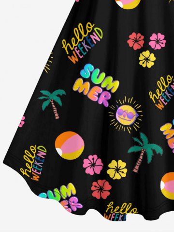 Plus Size Colorful Coconut Tree Sun Letters Floral Print Hawaii Backless A Line Tank Dress - Black - 6x