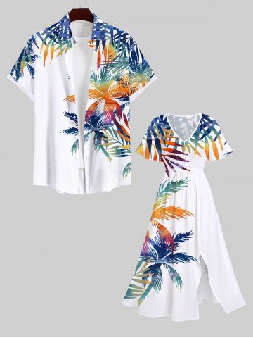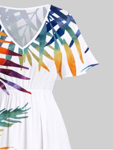Plus Size Colorful Coconut Tree Tropical Leaves Print Hawaii Split Pocket A Line Midi Dress - White - 5x