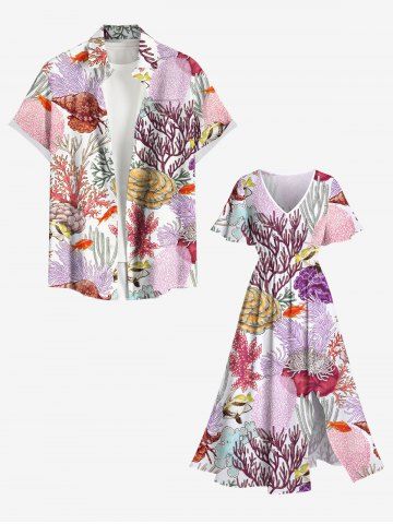 Graphic Dresses > Plus Size Colorful Coral Conch Shell Fish Print Hawaii Split Pocket A Line Midi Dress