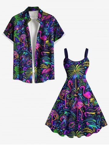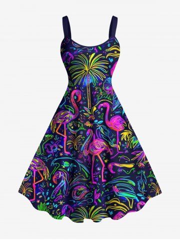 Graphic Dresses > Plus Size Colorful Flamingo Coconut Tree Print Hawaii Tank Dress